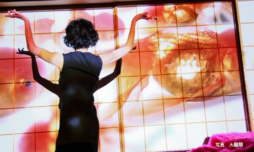 寺田みさこさんの身体を通して内側から自噴してくるエネルギーが、静かな激しさをこちらへ送ってくる。タバコの煙をまとわりつかせるアンニュイな映像では、時に視線を撥ねつけるようだ。障子に映る影は、格子の縦横の線が女を束縛する縛りのように見え、息苦しくなる。しかし一転、明るい赤の金魚とコラボレーションでは自在に泳いでいる。寺田さんも金魚たちと同じく、屈託なく自然で誇り高く心のままに自由だ。高尾太夫もお七もその身体の死後には、この金魚や寺田さんのように魂の自由を獲得しただろう。自分が決意した死とは、究極の自由なのかもしれない。